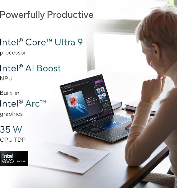 - Powerfully productive - The Zenbook DUO delivers powerful performance and AI-ready features on Windows 11. The ultra-fast Intel Core Ultra 9-185H processor up to 5.10 GHz , paired with Intel Arc graphics, enhances tasks with AI capabilities. With 1TB SSD storage and 32GB LPDDR5x RAM, you can explore more seamlessly.